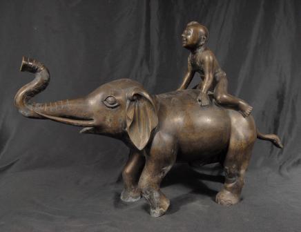 You are viewing a fabulous hollow bronze casting of an elephant with a small boy sitting on top. The piece is very characterful and fun, as the small boy appears to be laughing his head off and the elephant blowing his trunk. Perhaps they are in a race of some sort?