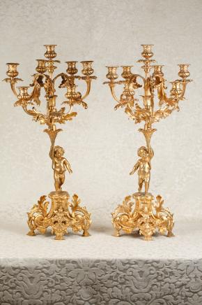 – Come view these in our Hertfordshire warehouse, just 25 minutes north of London You are viewing an absolutely fab pair of French rococo ormolu candelabras with two cherubs each holding up the main branch. This pair just reek of quality – the casting is very intricate and I hope the photos do this some justice. Particularly on details like the leaves which have all the veins finely replicated in relief. Similarly the cherubs faces and all the fantastic details on the bases.