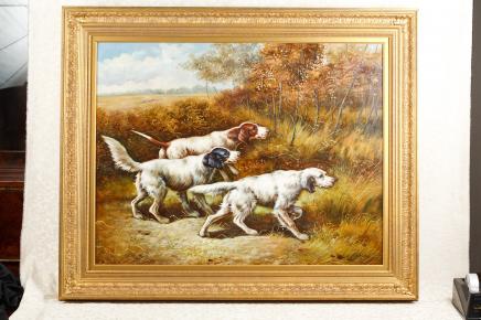 – Gorgeous English oil painting depicting three retrievers in a country setting