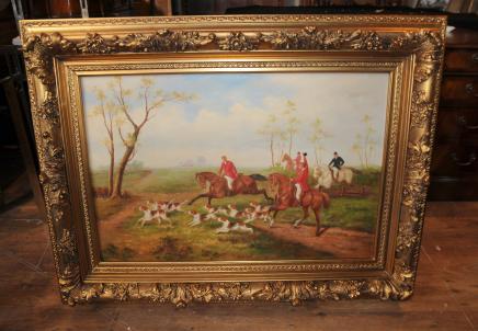 – Classic English Victorian style oil painting of a classic fox hunt scene