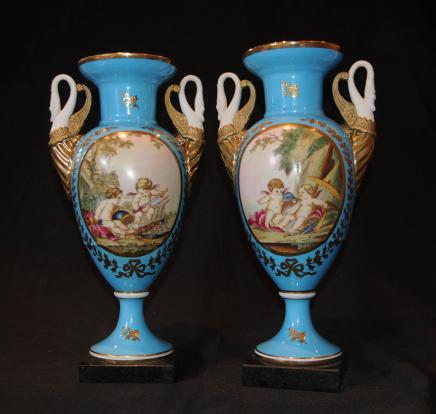 – Gorgeous pair of French porcelain urns in the Sevres manner
