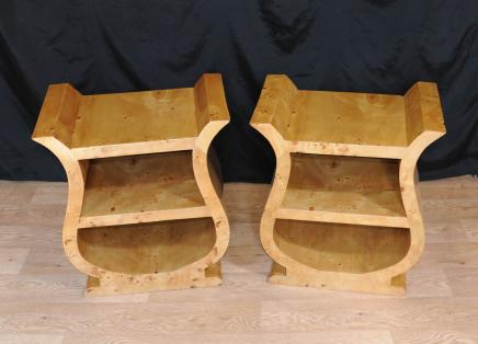 – Gorgeous pair of art deco style bedside tables in blonde walnut