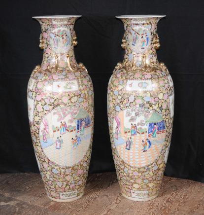 – Pair large Japanese Rose Satsuma style porcelain amphora urns